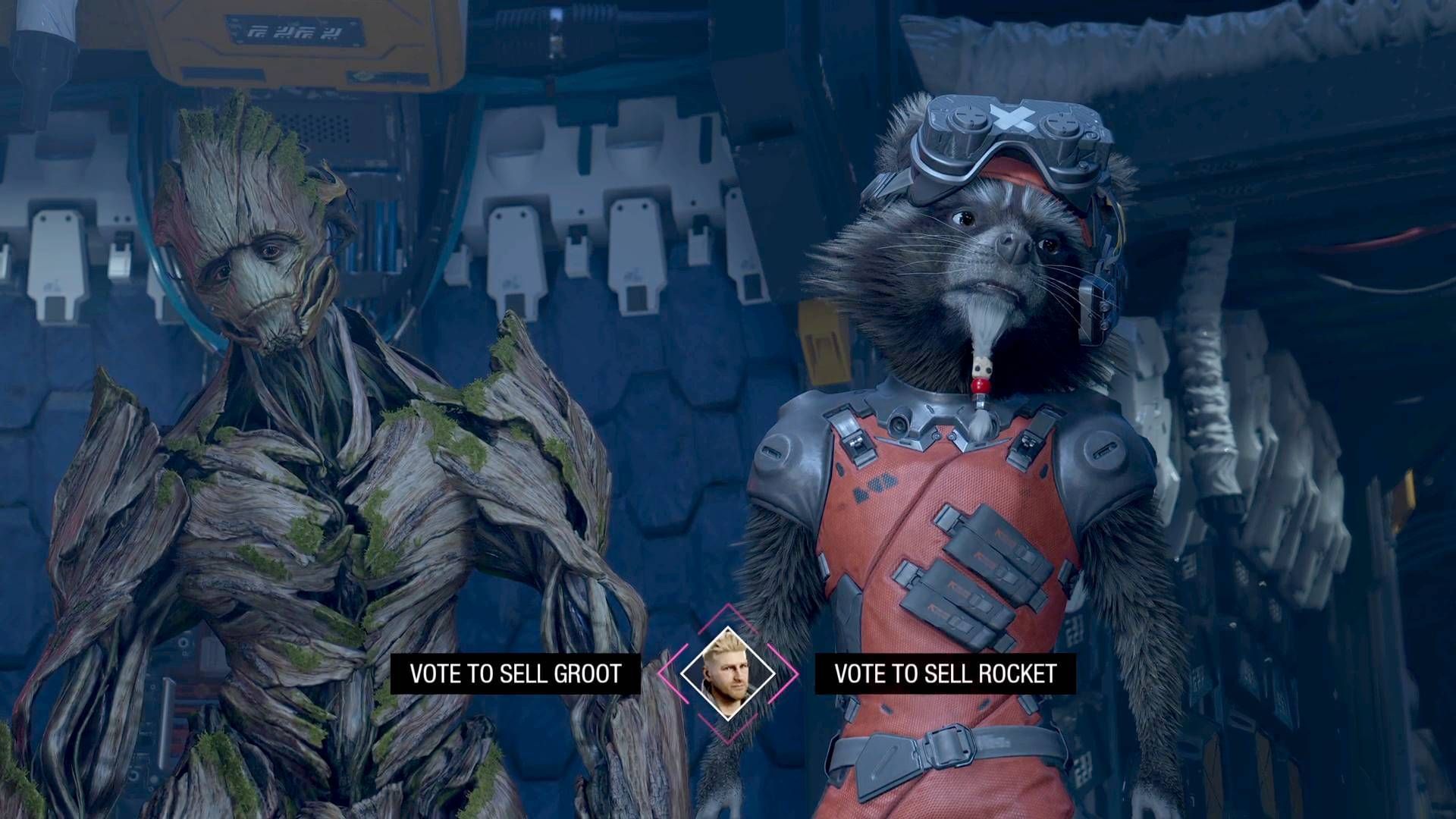 Now that you know what happens when you present Rocket for sale, you want to avoid that altogether. Vote to sell Groot to Lady Hellbender in Marvel's Guardians of the Galaxy.