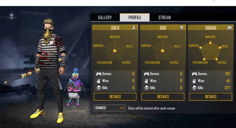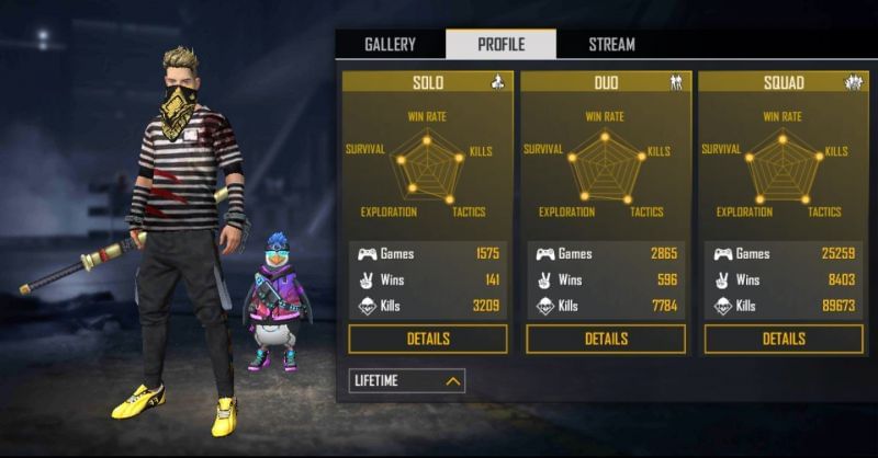 He has secured 141 wins in 1575 matches in the solo mode, maintaining a win percentage of 8.95%. The YouTuber has also killed 3209 foes at a K/D ratio of 2.24.