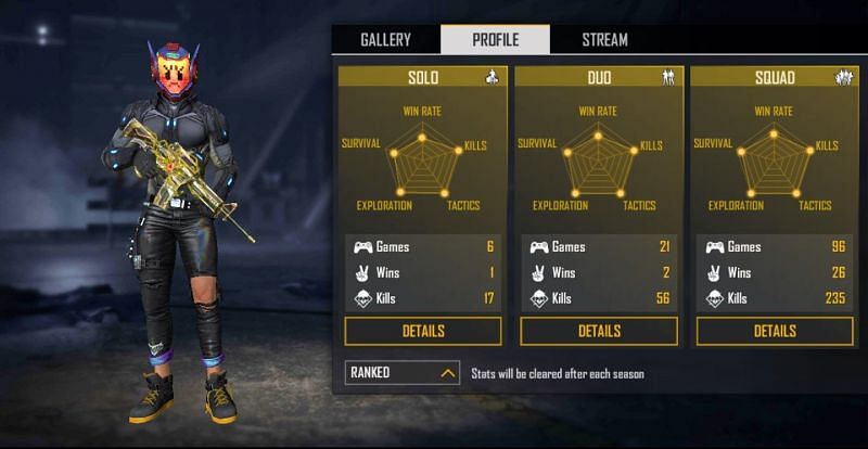 In the current ranked season, the content creator has played 96 games and won 26 of them, which translates to a win rate of 27.08%. He has 235 kills in the mode with a K/D ratio of 3.36.