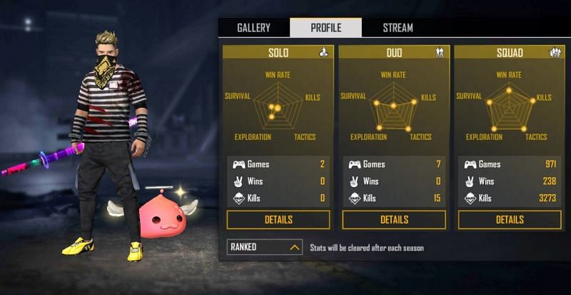 The popular content creator has also played 7 duo games, bagging 15 frags at a K/D ratio of 2.14. He has also played 2 solo matches this season but is yet to register a win.