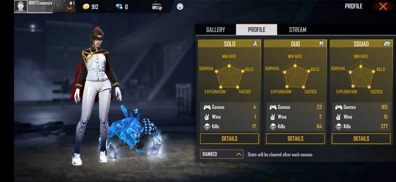 The popular content creator has also played 85 ranked duo matches and has 10 victories to his name, making his win rate 11.76%. He has collected 215 kills at a K/D ratio of 2.87 in this mode.