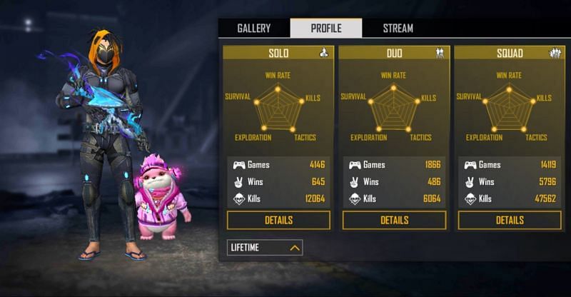 The content creator also has 603 Booyahs in 2914 duo games, equating to a win percentage of 20.69%. He has amassed 7902 frags and has retained a K/D ratio of 3.42.