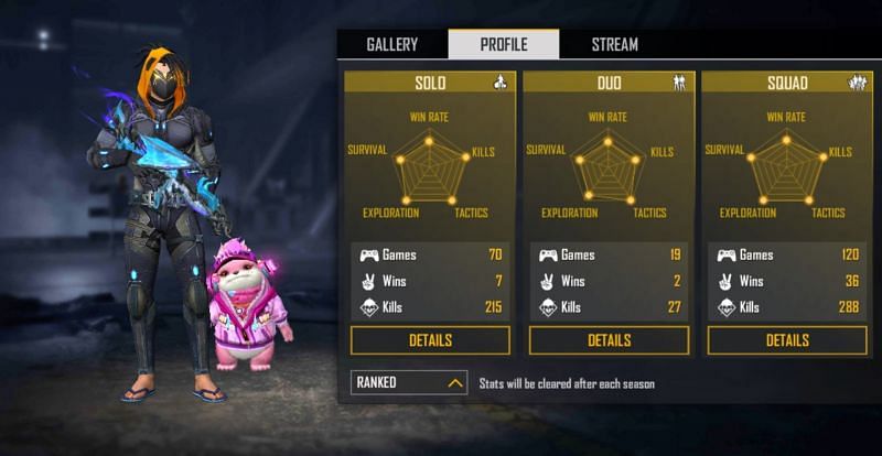 The YouTuber has participated in 70 solo games and has a win tally of 7 matches, i.e., a win ratio of 10%. He has knocked off 215 foes and has upheld a K/D ratio of 3.41.