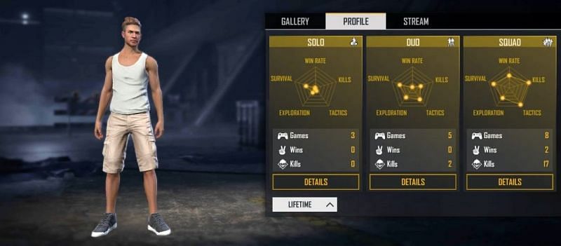 Lifetime stats refer to the cumulative stats of the ranked and classic modes across all seasons. Regaltos has played only a few games, and hasn't unlocked the ranked mode. He has played only a handful of classic games across all the modes as well.