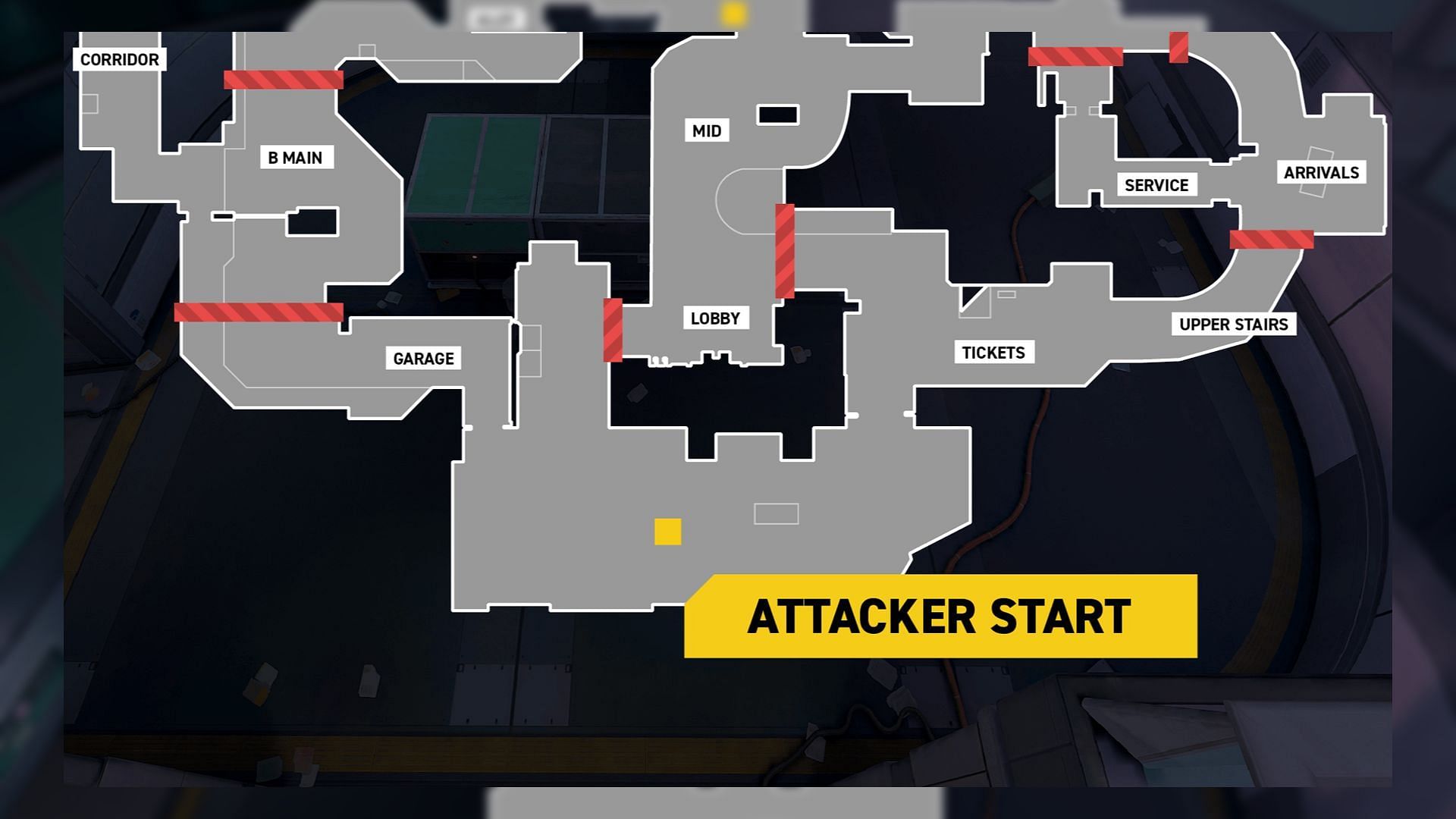 The Attackers can choose to take one of three routes - Mid control through Lobby, B-Site entry through Garage, or A-Site control through Upper Stairs. Due to the 3v3 match format, the team will need to hold down one site and move through a single route to successfully plant the Zeus.