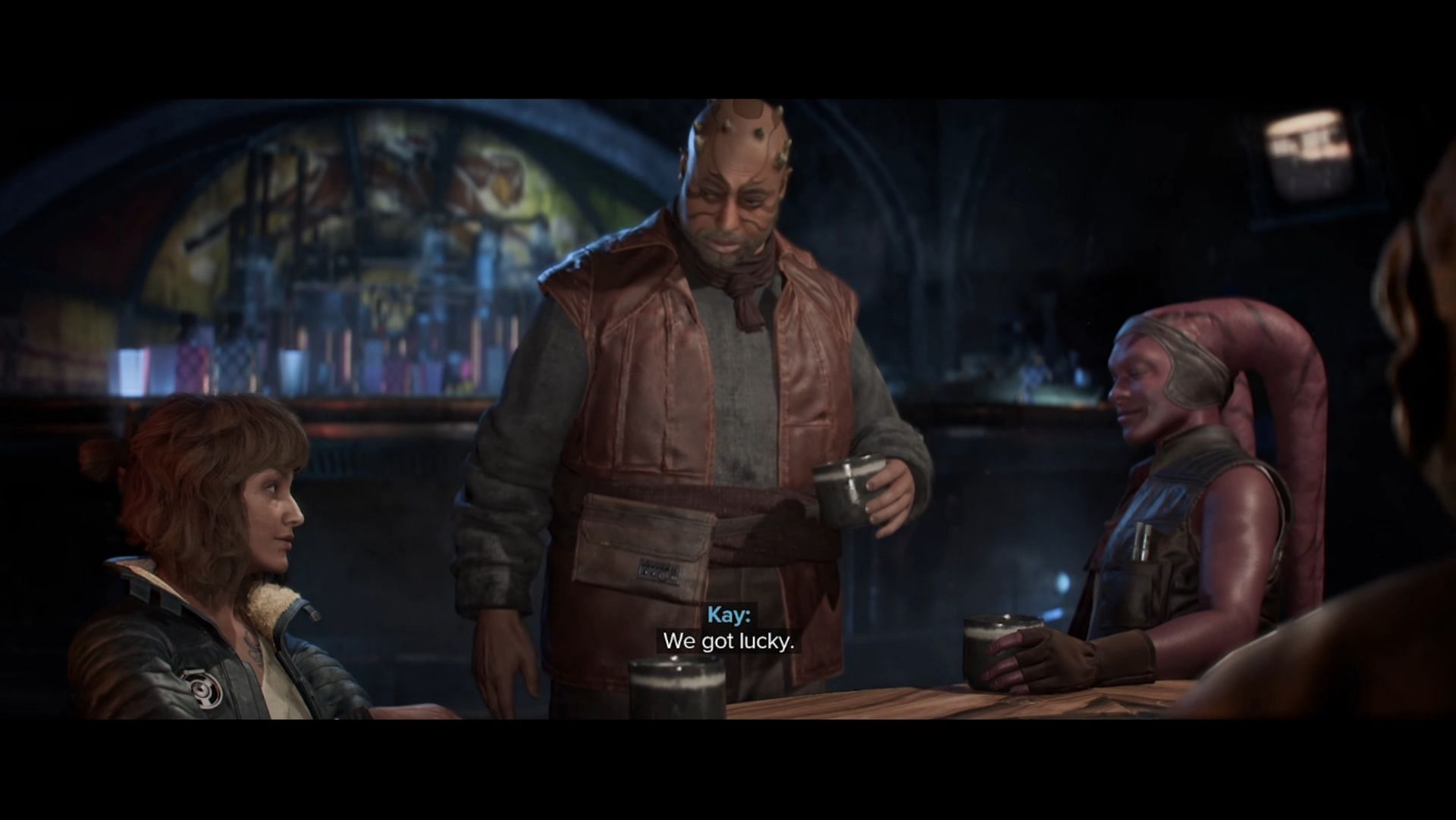 Kay Vess ultimately had one goal throughout Star Wars Outlaws, and that was to be free. She didn’t want to have to go on crazy heists and do fantastic missions. She wanted to travel with Nix, and just be free. After the battle with the Imperial Star Destroyer, she jumps to hyperspace. The next scene plays out in Cantonica, where Bram serves drinks for Kay Vess and her team of scoundrels.