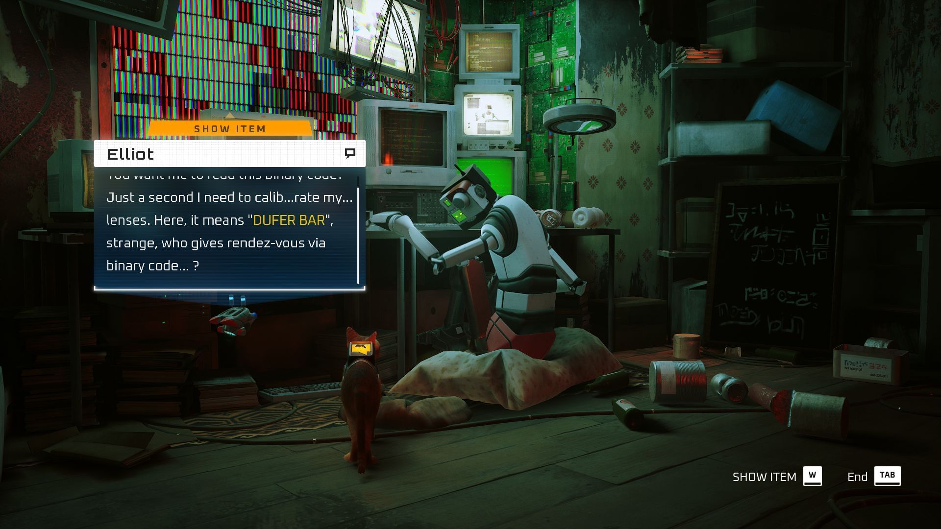 Elliot decodes and says that the rendezvous point is the Dufer Bar. Players will then leave the house and make their way back to the Guardian. After making the short right turn, they will notice the bar on their right with a couple of robots and the bartender inside.