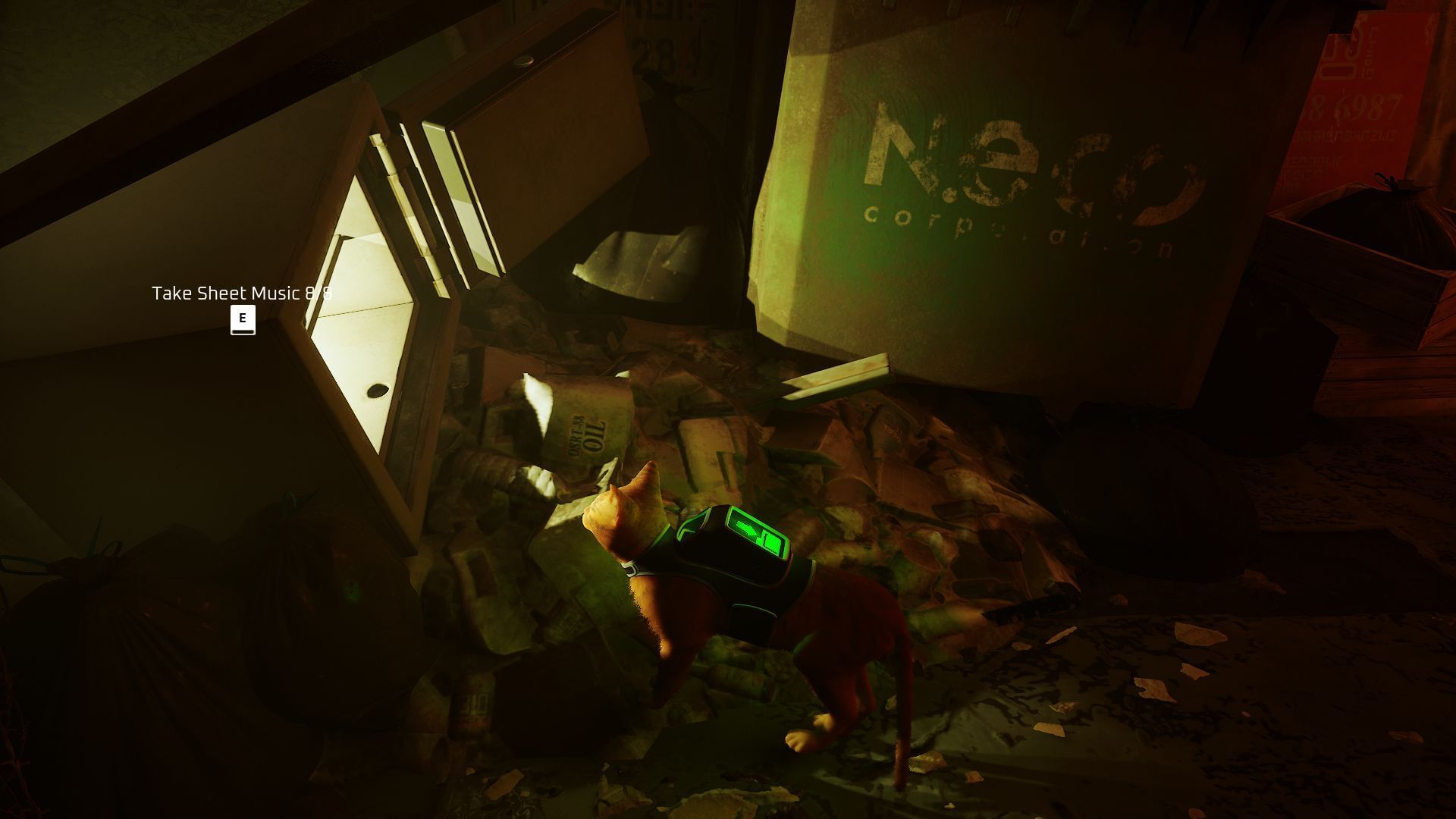 The cat can easily walk through the bars at the bottom of the door. Players can get to the music sheet by jumping up to the shelf.
