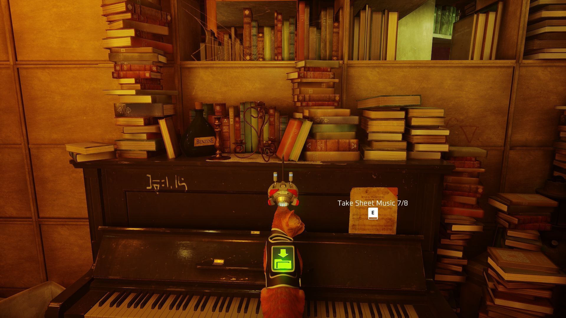 This can be found when the player goes in search of Doc's notebook. This apartment is filled with piles and stacks of books, which make for an interesting solution. Players will notice a small room in the middle with a grand piano and a dead robot holding a book.