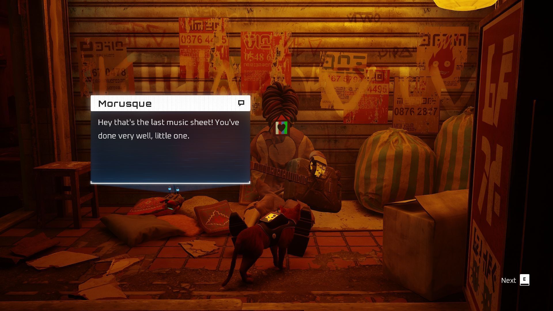 Stray features a handful of unique humanoid robots for players to interact with, and Morusque is one of them. A street musician with a petrol-can guitar and no songs, they can be found on the left of the Guardian in an empty sitting under a canopy.