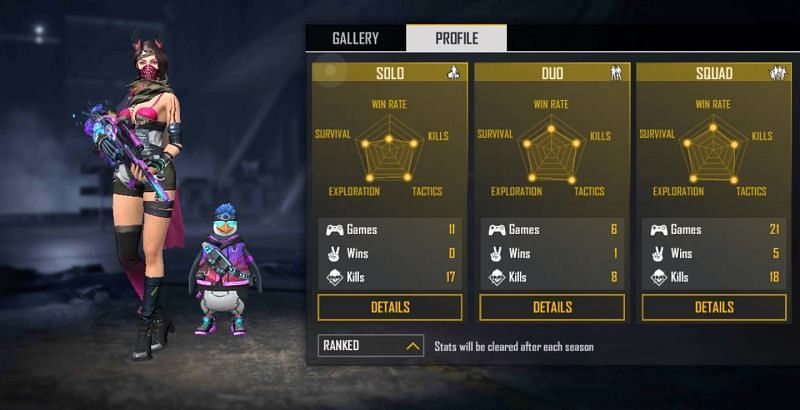 Apart from this, the YouTuber has played six duo matches and has a single win, managing a win rate of 16.66%. He has killed eight enemies at a K/D ratio of 1.60.