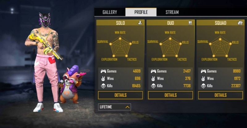When it comes to the duo mode, the Free Fire pro has played 2467 matches and has emerged victorious in 376 of them, translating to a win rate of 15.24%. He has 7738 frags in this mode, with a K/D ratio of 3.70.