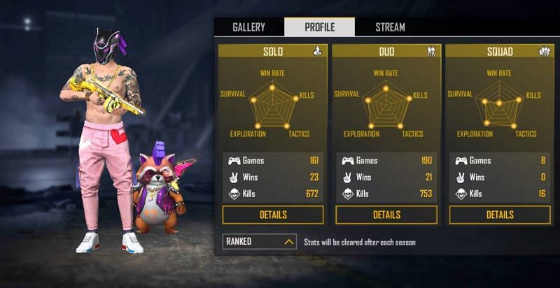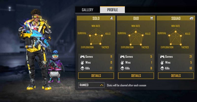 The popular YouTuber has 26 Booyahs in 101 duo matches, making his win rate 25.74%. With a K/D ratio of 4.12, he has 309 frags in this mode.