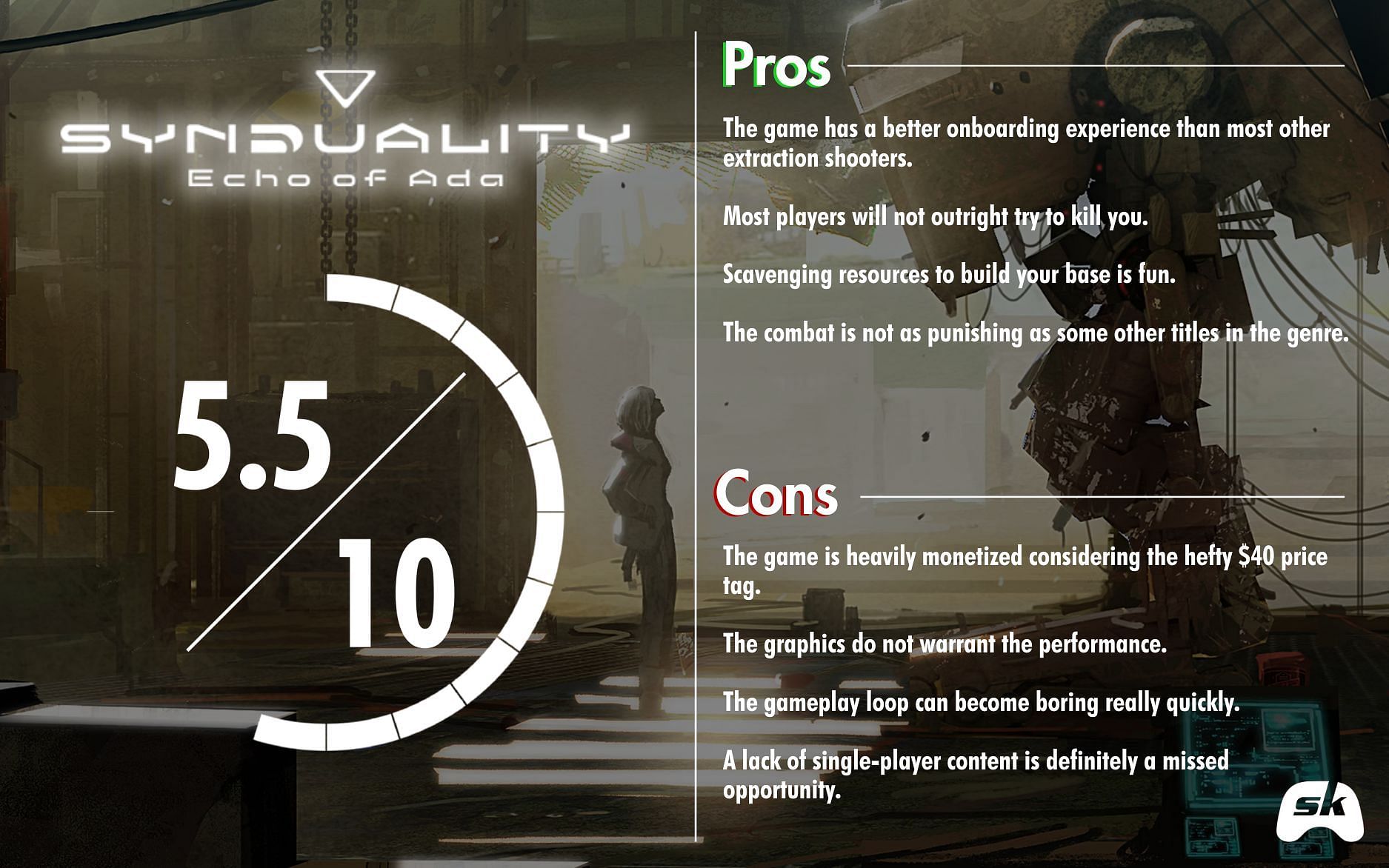 If you are looking forward to picking something to have a mindless adventure for a few hours without worrying too much about the hardcore action of something like Tarkov, Synduality can be for you. Despite its jank and monetization issues, it still provides a casual extraction shooter experience with the added touch of exploring the world in a mech. It is also extremely casual-friendly.
