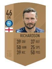Richardson, on the other hand, is rated 46 overall with a diving score of 39, handling at 50 and kicking at 39. His reflexes are at 37, speed is very low at 25 and his physical is at 50. Richardson also has a 1-star skill move and a 2-star weak foot.