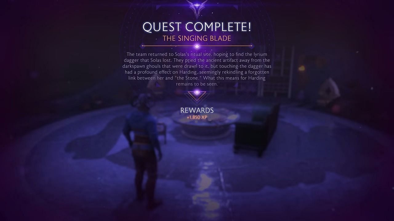 To start the Singing Blade quest, talk to Strife and Irelin at Shadows Crossing after Solas’s Ritual. They will direct you to return to the Ritual Site, where Solas previously lost the Lyrium Dagger, to retrieve it before the Evanuris seize it. When you arrive there, you’ll talk to Harding, who’s still wrestling with her involvement in the Solas incident.