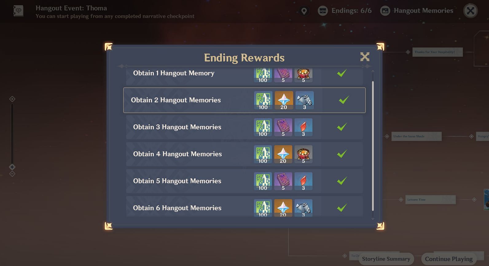 Thoma's Hangout Event has six different endings, and you get additional rewards for each ending you complete in Genshin Impact. In addition to prizes like Primogems and Adventure EXP, you can also obtain Hangout Memories: exclusive illustrations featuring Thoma and the Traveler.