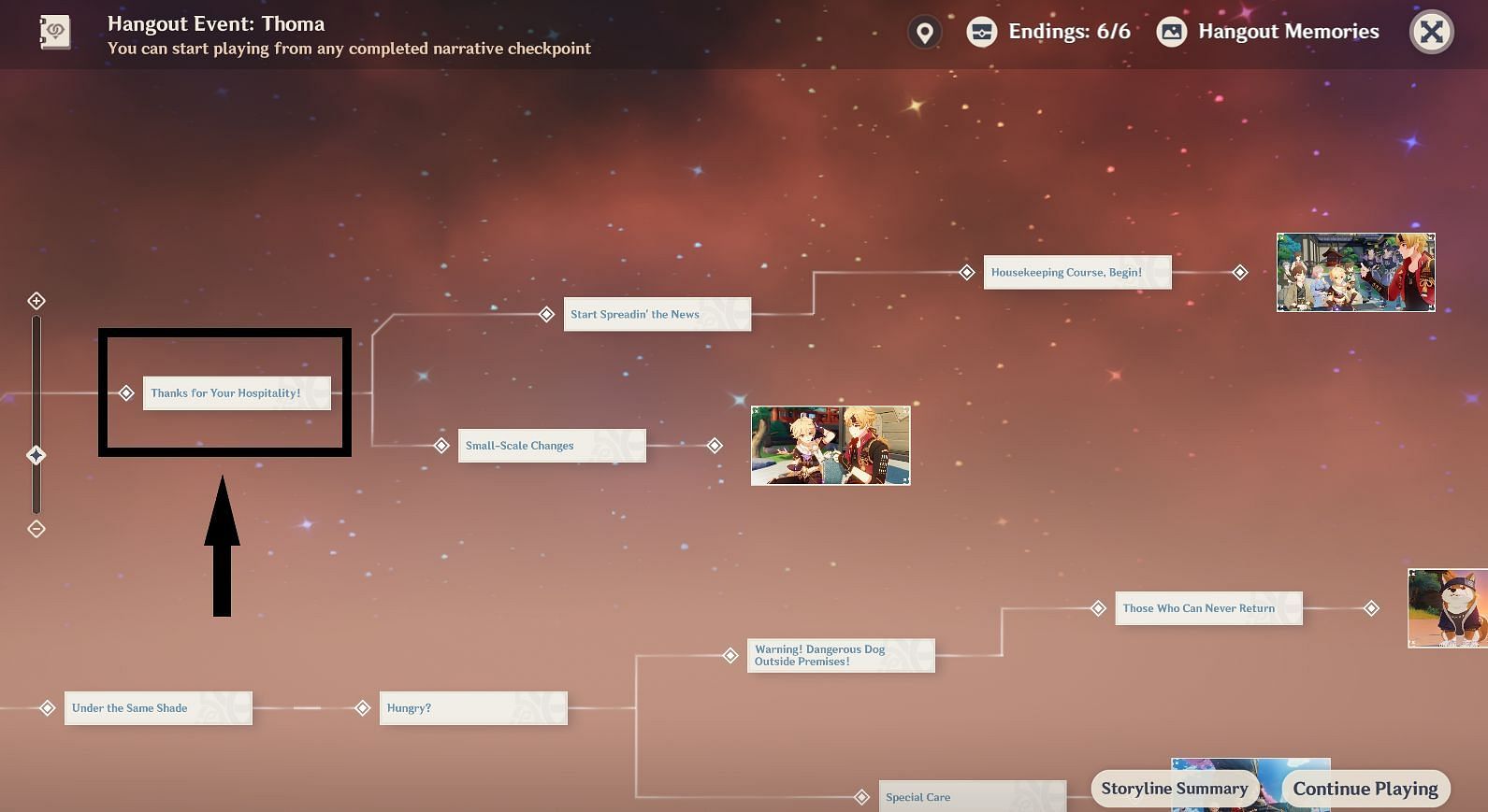 Instead of starting all over, you can choose to redo the 'Thanks for Your Hospitality!' chapter from Thoma's Hangout Progress on the event page.