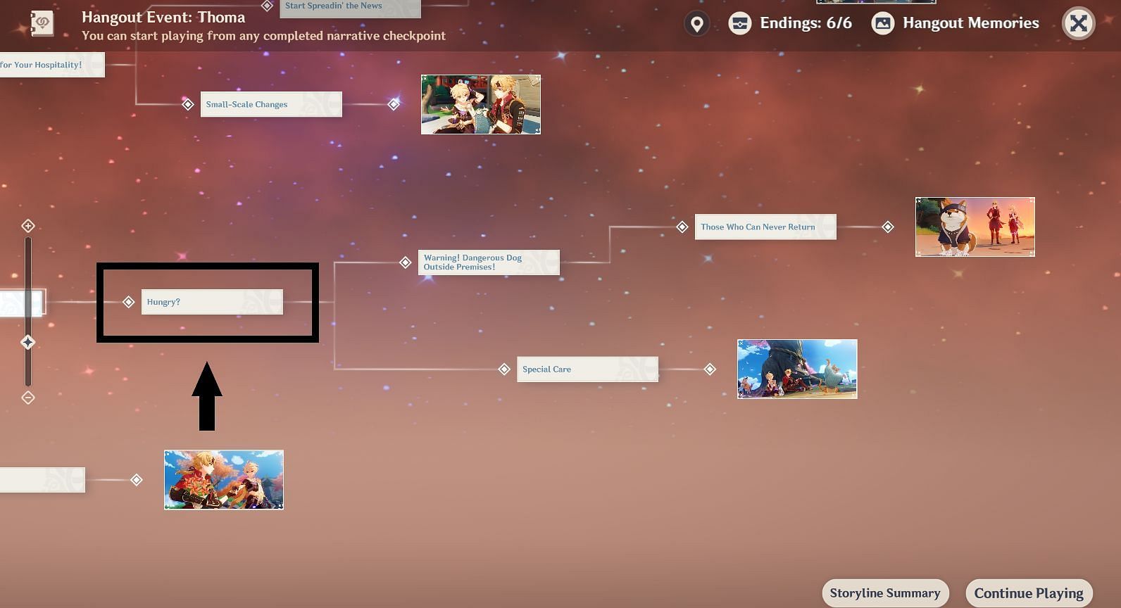 For a shortcut, you can start by entering the 'Hungry?' chapter on Thoma's Hangout Progress.