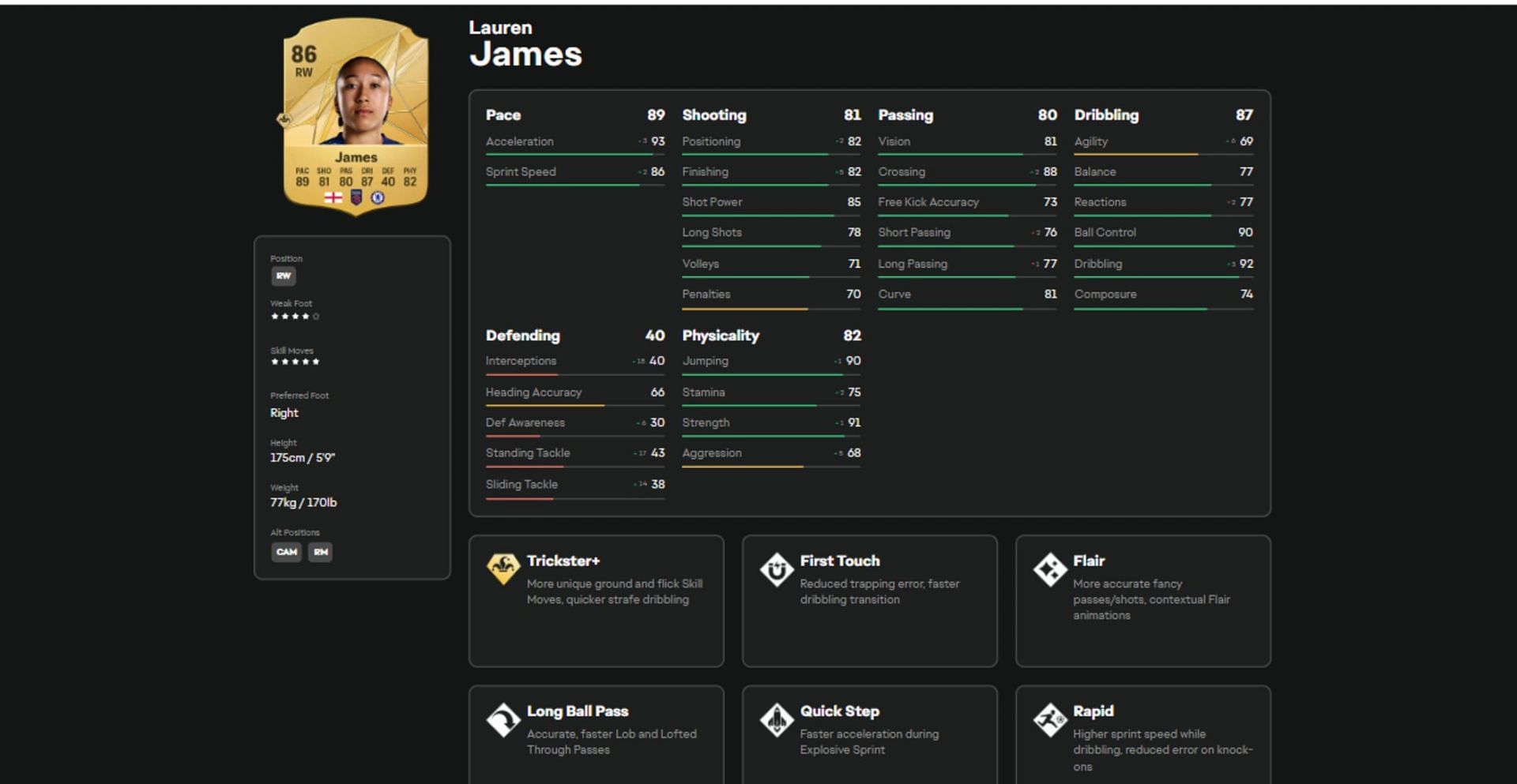 James’ agility and speed (89 pace) make her an exciting winger to have in EA FC 25. With increased dribbling (+2), she can easily take on defenders, while her upgraded shooting (+3) makes her a potent goal threat from the right wing.
