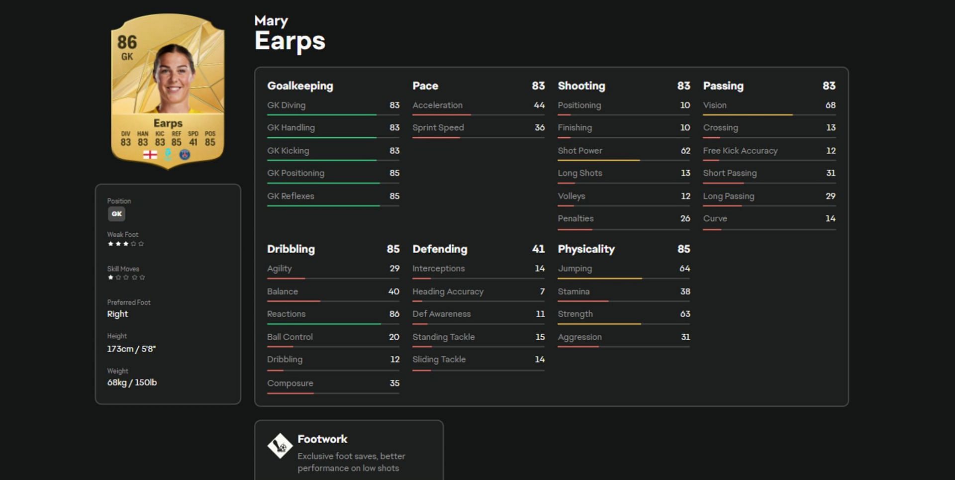 Earps’ reflexes (85) and positioning (85) make her one of the most reliable goalkeepers in EA FC 25.