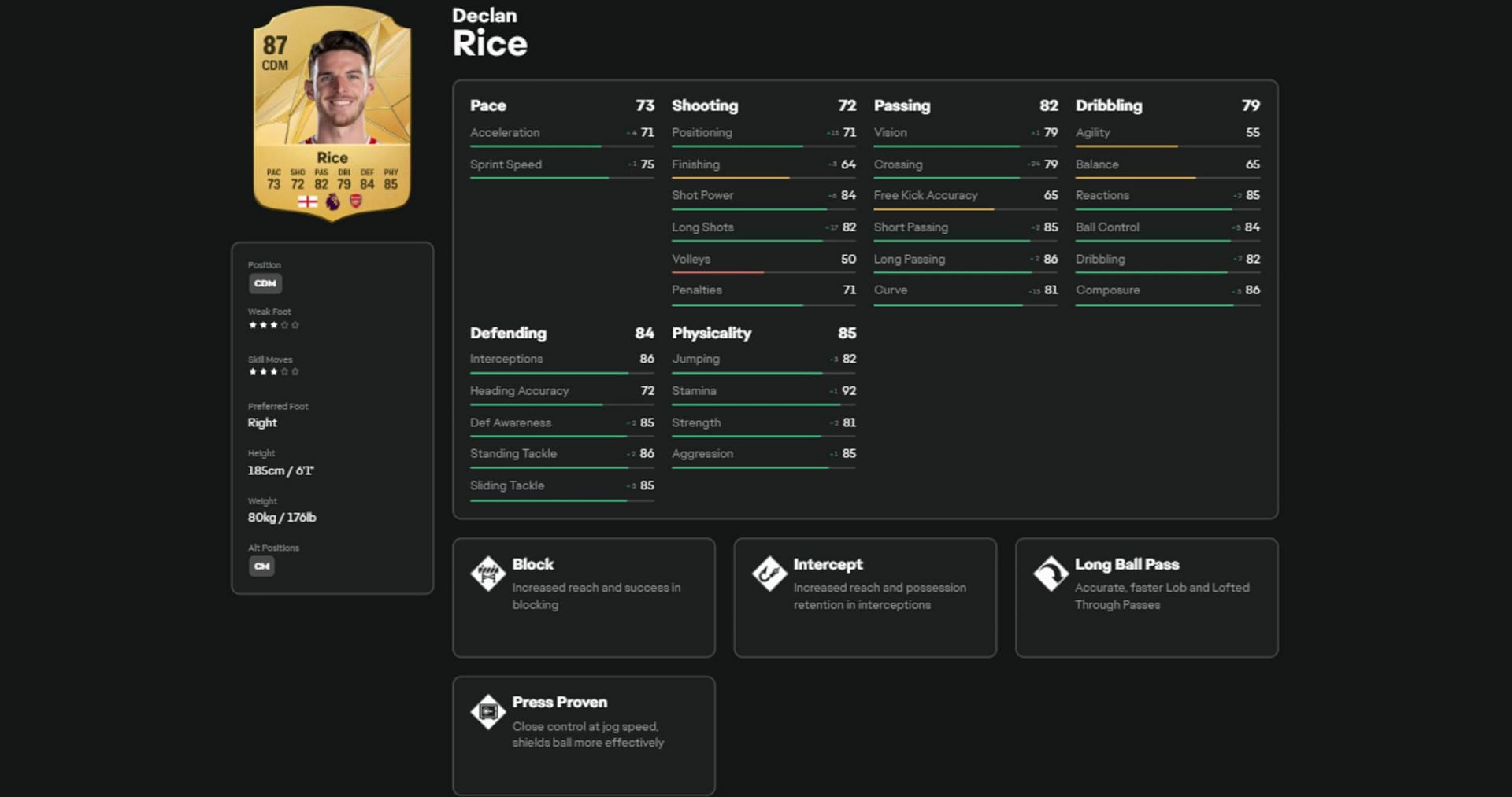 As a defensive midfielder, Rice is outstanding at breaking up attacks with his high defending (84) and physicality (85). His improved passing (+7) and dribbling (+2) allow him to link up play more effectively, making him more versatile in possession.