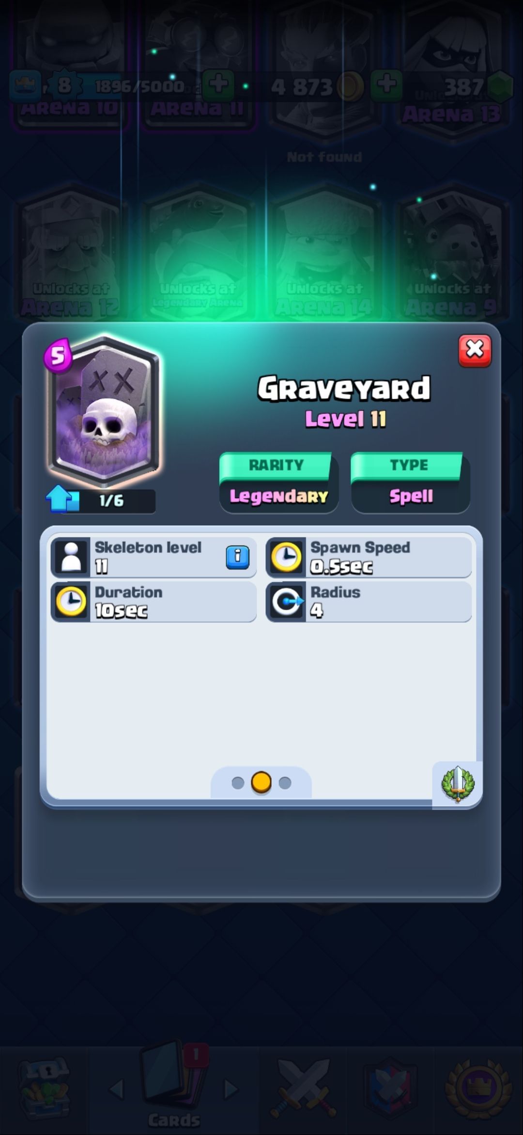 The Graveyard card is a Legendary card that creates 15 Skeletons and has a large radius. The Skeletons arrive one at a time on the boundary of the spell's radius. As a spell, the Graveyard can be used anywhere in the Arena.