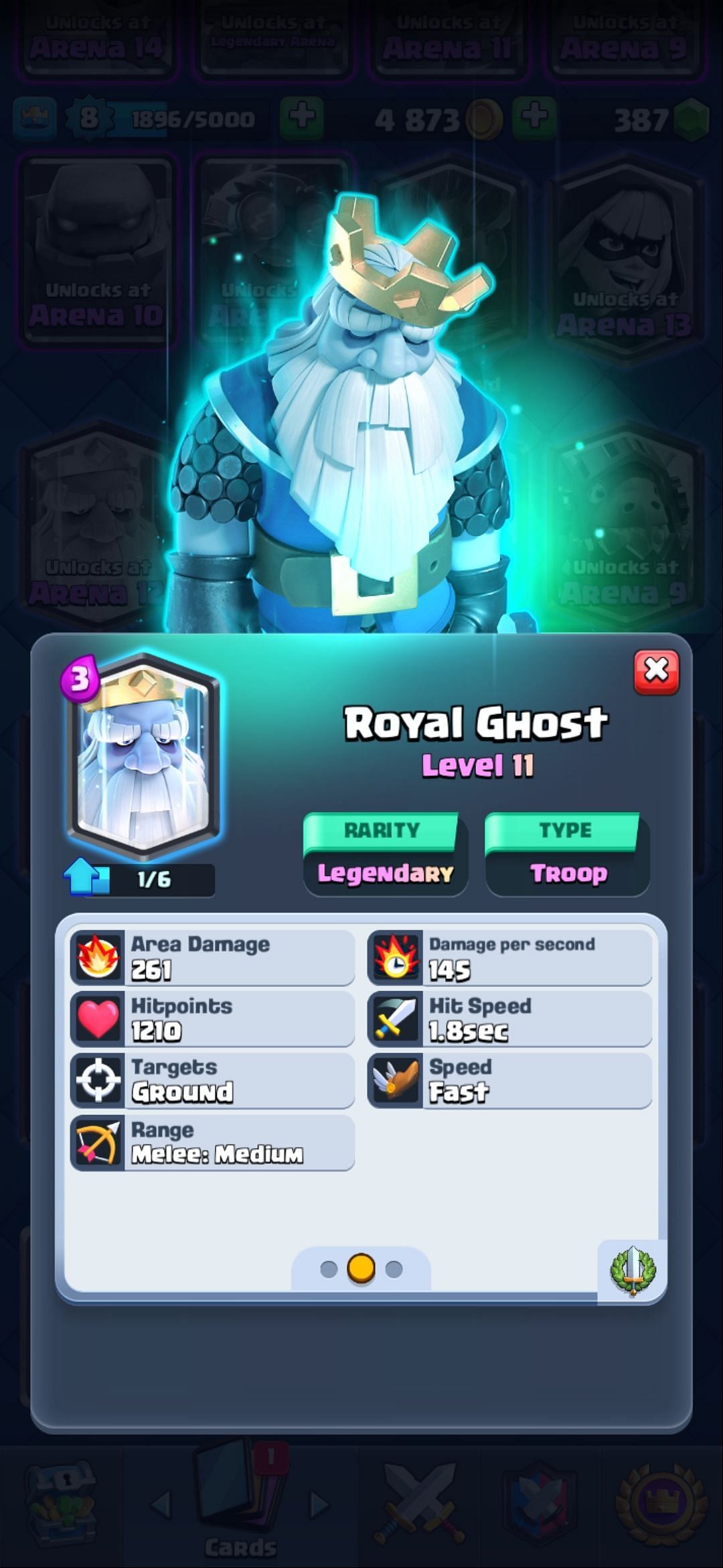 The Royal Ghost is one of the strongest Legendary Cards in Clash Royale as it can avoid enemy defenses and reach the enemy without being noticed. He is the only troop in the game that stays invisible unless he attacks an enemy building or troop.