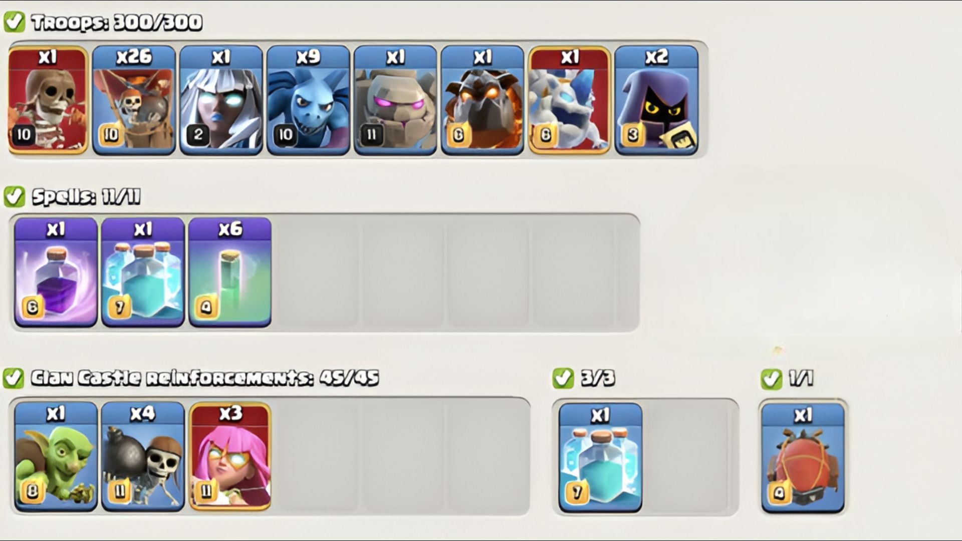 - Troop composition: One Super Wall Breaker, 26 Ballons, one Titan, nine Minions, one Golem, one Lava Hound, one Ice Golem, and two HeadHunters.