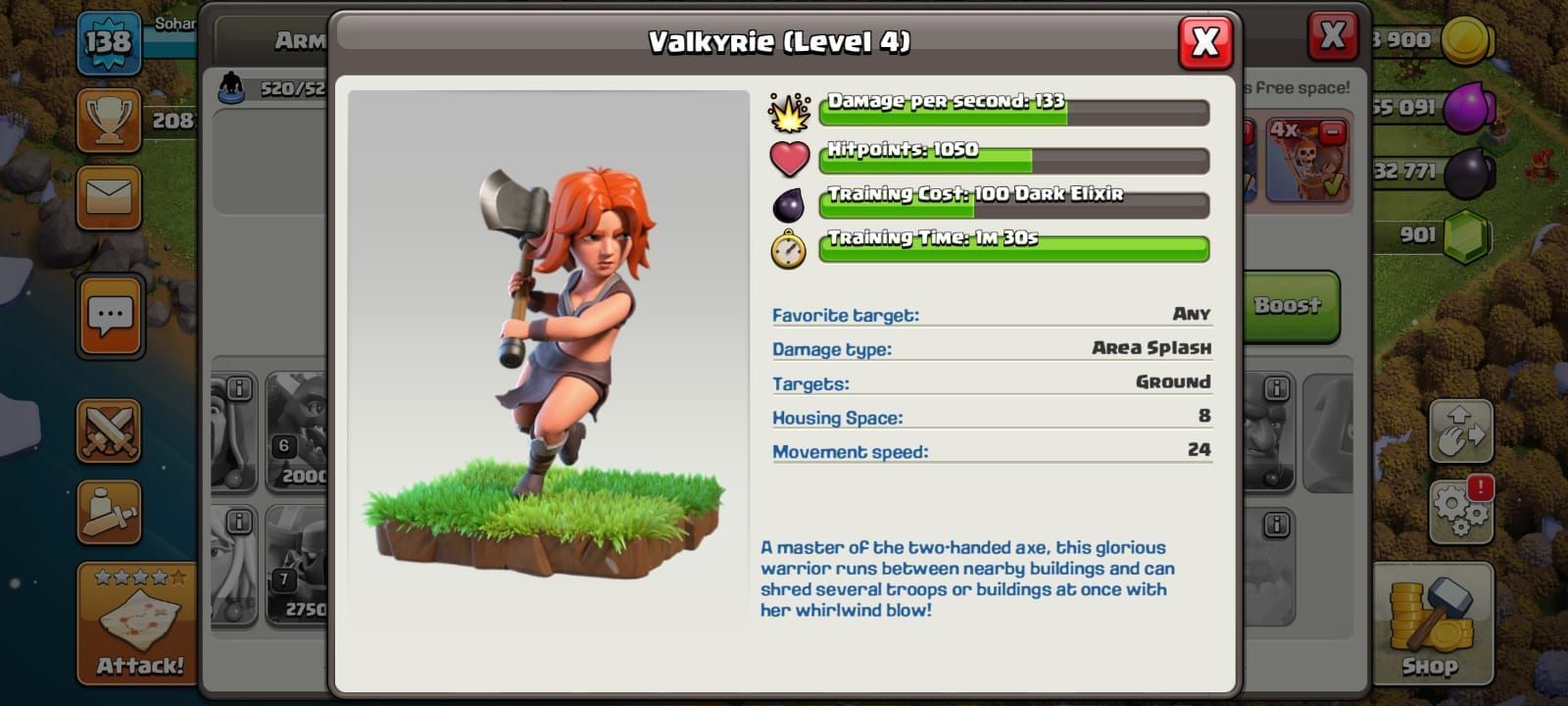 Valkyrie is one of the strongest and most difficult-to-use Dark Troops available in the game. It was made available on March 12, 2013. Valkyrie has 9 levels at the moment, deals a damage of 94 per second and has 750 Hit Points at the base level.