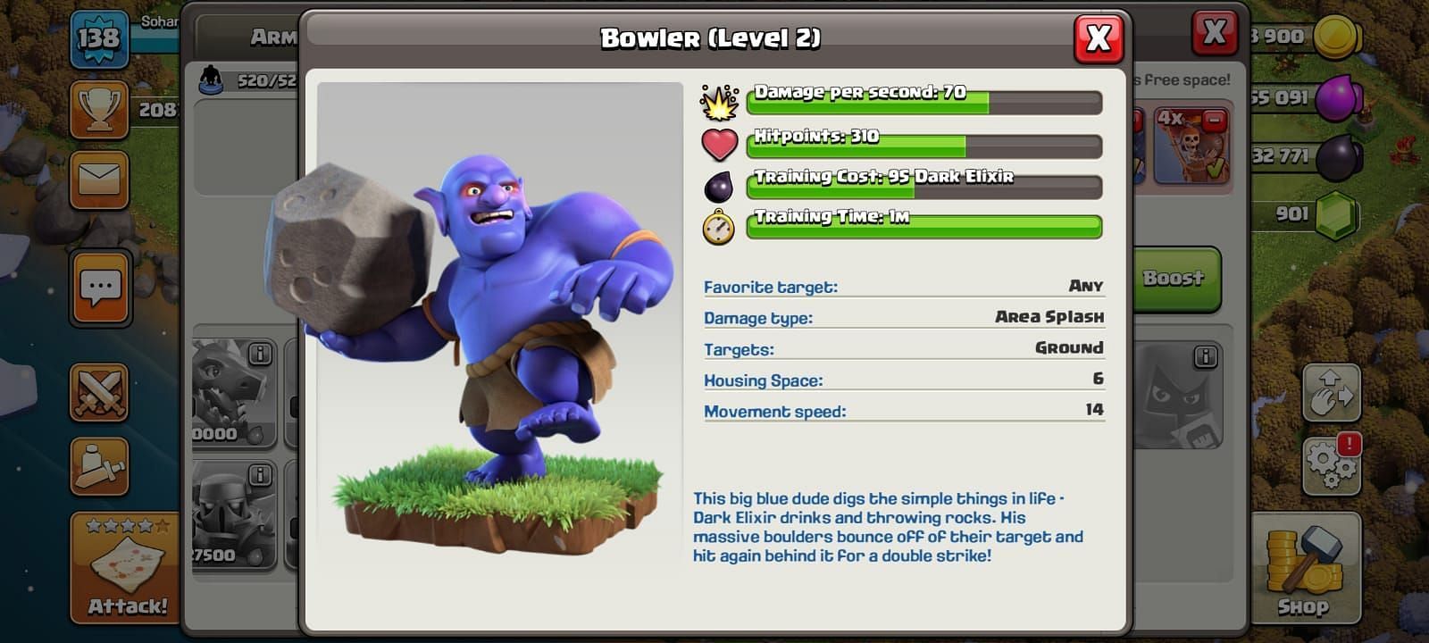 Bowler, a Dark Troop that unlocks on reaching Town Hall level 10, was made playable on March 21, 2016. Bowler has 6 levels at the moment and deals a damage of 60 per second at the base level. It has 290 Hit Points at the base level.