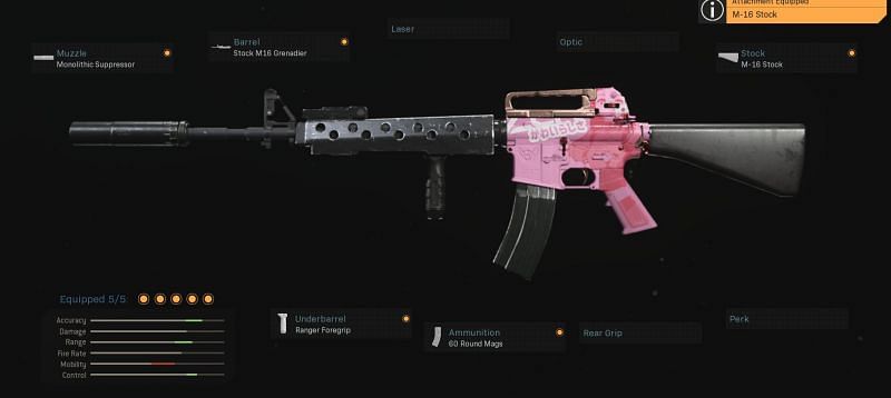 The best loadout in COD: Warzone comes courtesy of Twitch streamer Nickmercs. Nick uses a an M4A1 with a Monolithic Suppressor, Stock M16 Grenadier, M-16 Stock, 60 Round Mags, and Range Foregrip. The accuracy and high rate of fire make it nearly unbeatable. It's easy to control and can take down enemies before they get the chance to retaliate.