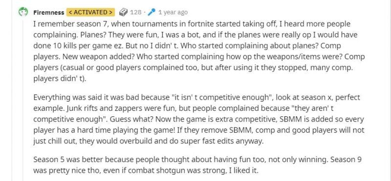 According to a few people on Reddit, competitive players complain about everything in Fortnite. One such user went on to point out that whenever something new got added to Fortnite, competitive players began complaining it wasn't competitive enough.