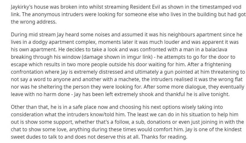 A detailed Reddit post explained exactly what happened, as Twitch streamer JayKirky's home was mistakenly broken into by intruders. They were apparently searching for someone else at his "dodgy apartment complex":