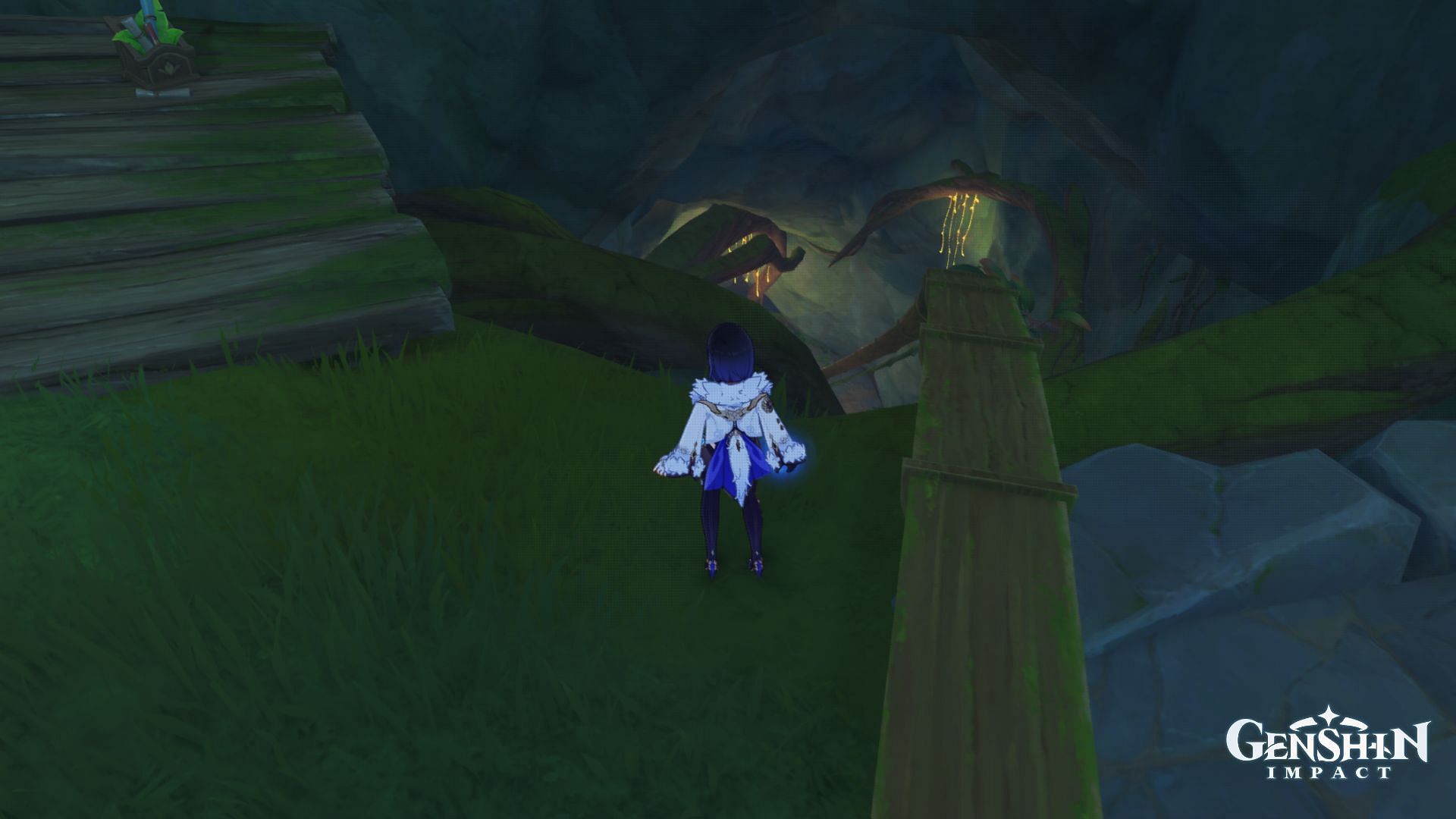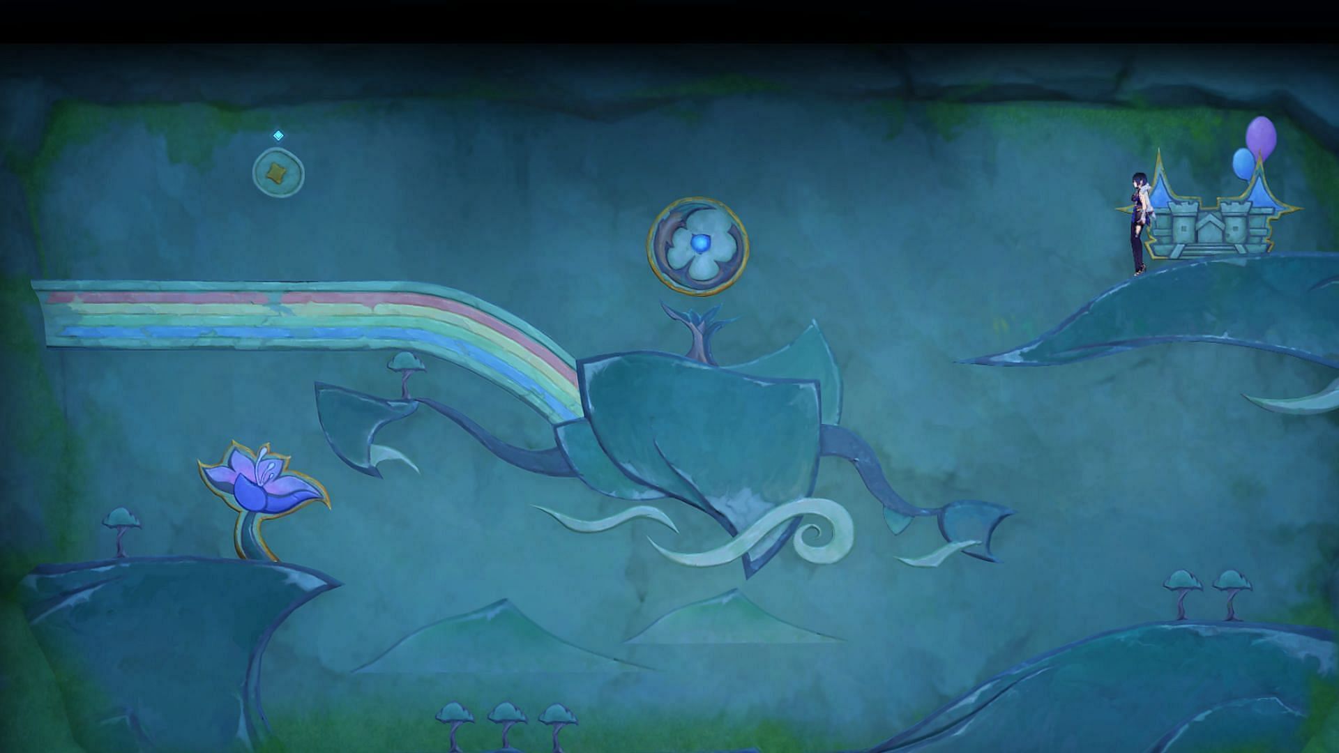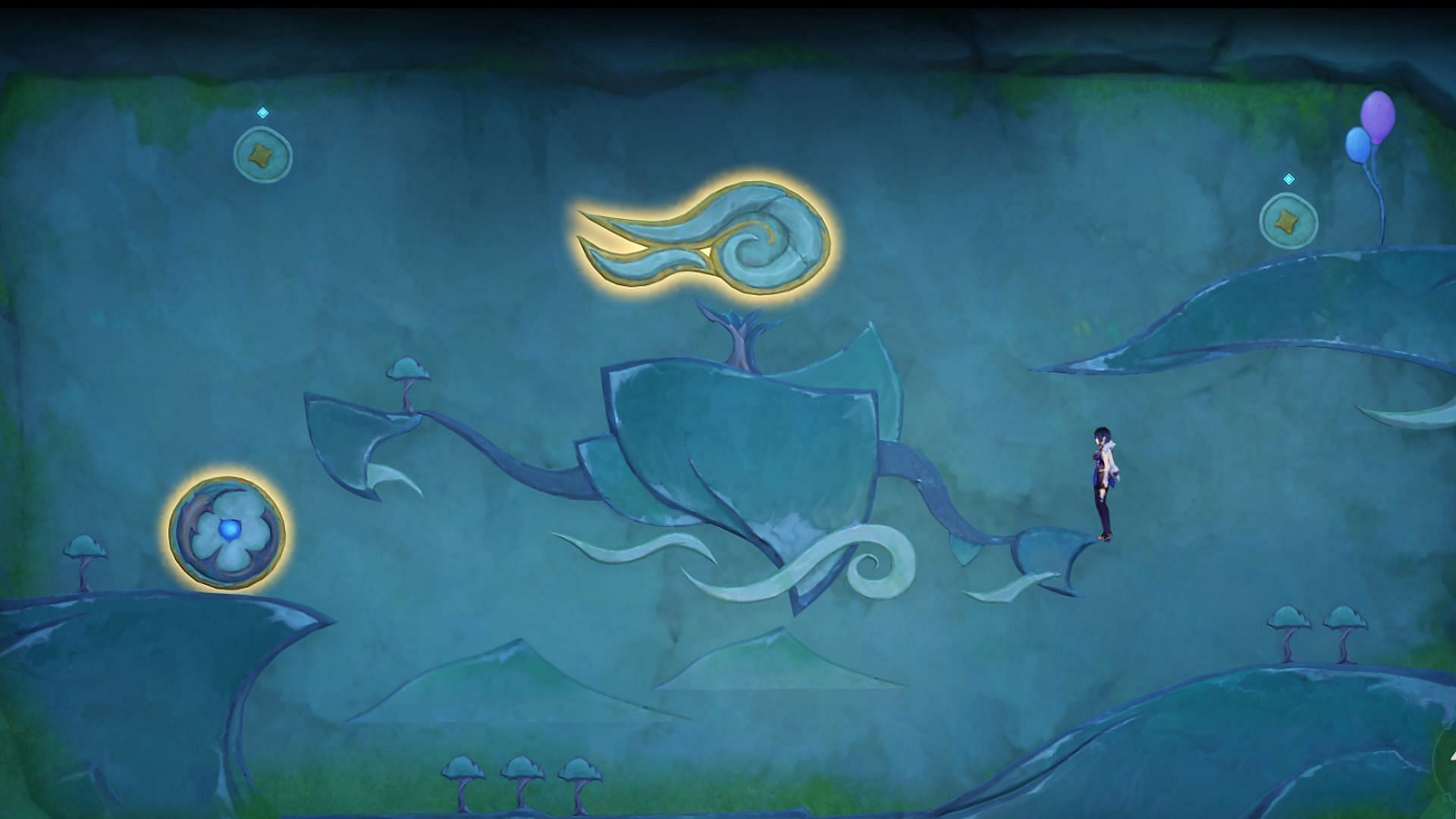 Genshin Impact players must interact with the Streaming Projector to do the above 2D puzzle. Head to the right and collect two of the mural parts. Afterward, jump up on this platform shown in the above image. Collecting the remaining two parts should be pretty self-explanatory from this point.