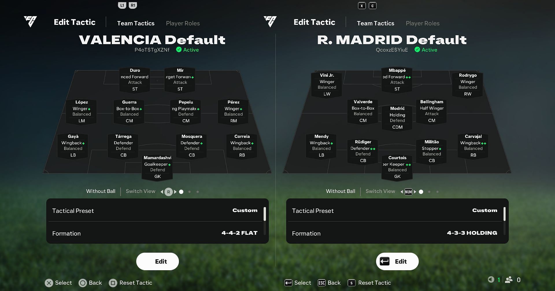 Valencia vs Real Madrid in EA FC 25: Formation comparison