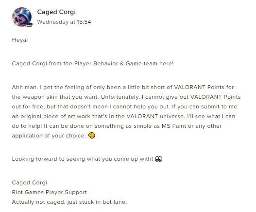 “Unfortunately, I cannot give out Valorant Points for free, but that doesn’t mean I cannot help you out. If you can submit to me an original piece of artwork that’s in the Valorant universe, I’ll see what I can do to help. It can be done on something as simple as MS Paint.”