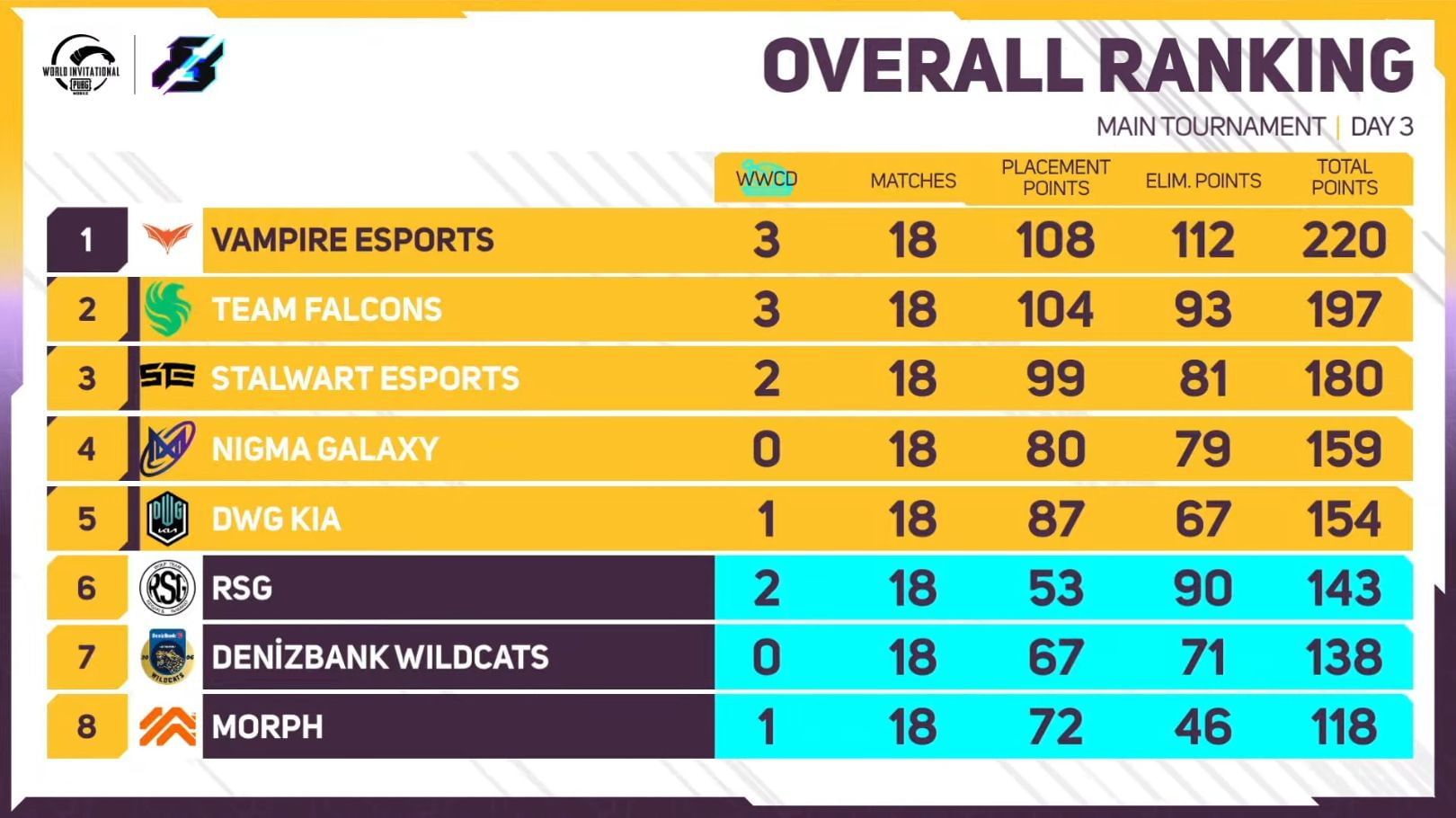 After Match 5, Vampire Esports held the pole position with 198 points, while Falcons were only two points behind them in second place. Stalwart was in third position with 178 points.
