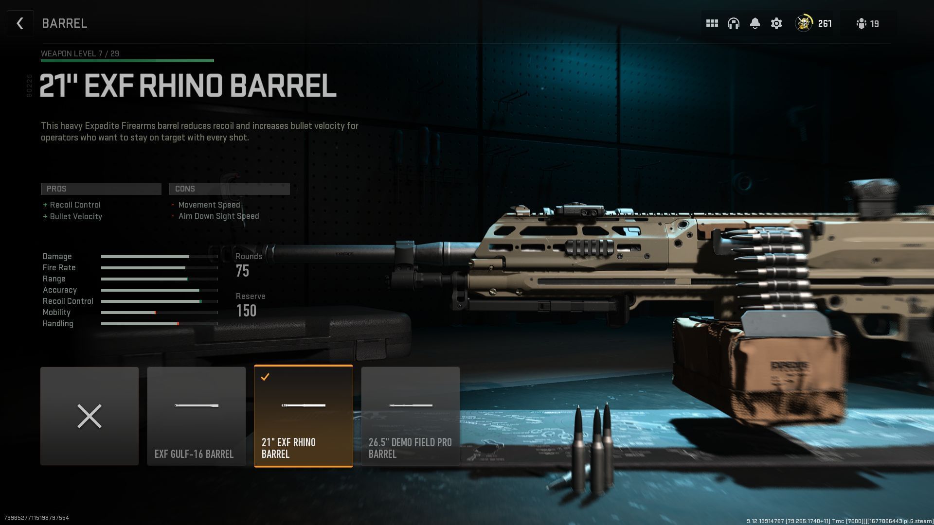 Barrel: 21" EXF Rhino Barrel further reduces the recoil. It also comes with other benefits, such as an increased bullet velocity, that allows players to hit targets at longer ranges quickly.