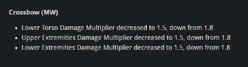 According to the official Warzone Season 5 patch notes, the Lower Torso Damage Multiplier of the Crossbow has been decreased from 1.8 to 1.5. Similarly, the Upper and Lower Extremities Damage Multipliers have been decreased from 1.8 to 1.5.