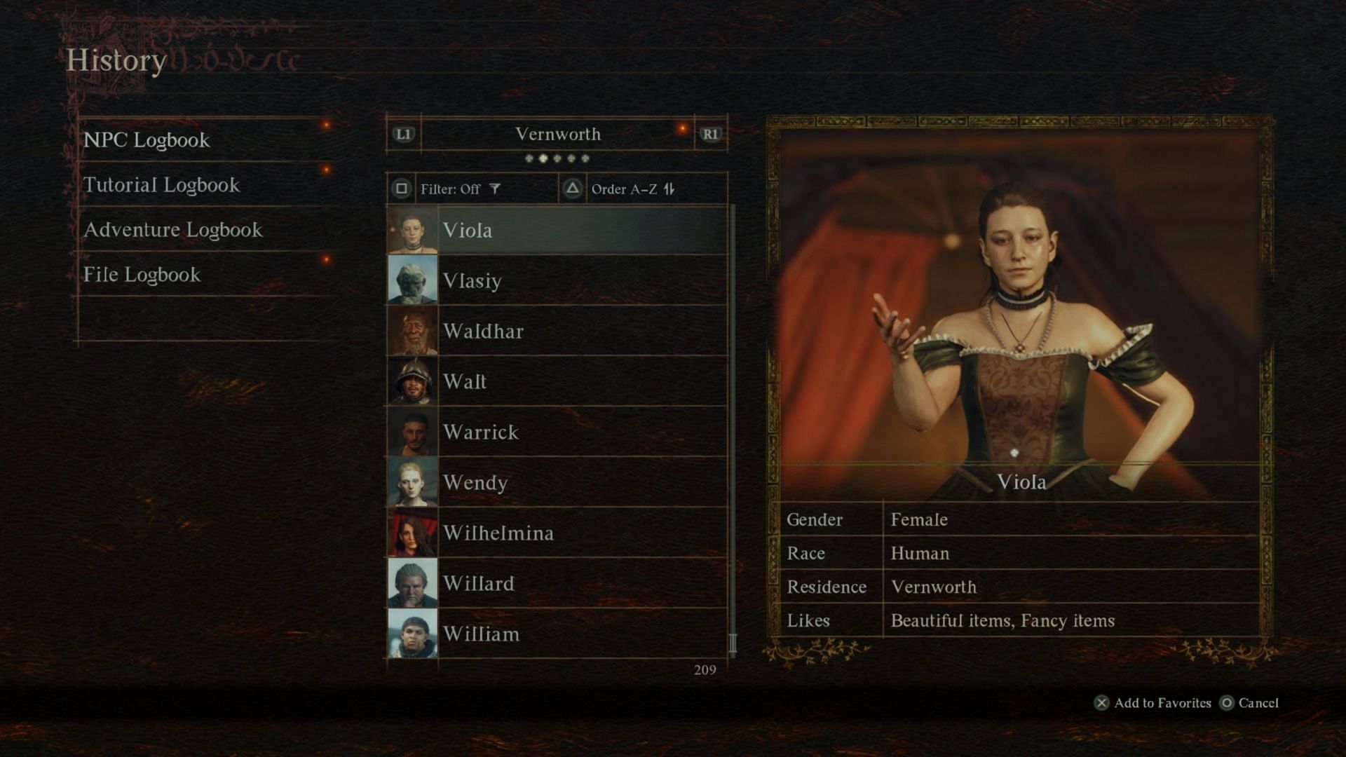 This system is almost entirely devoted to giving gifts to NPCs in Dragon's Dogma 2 - that’s how you build Affinity. If you find a character in the world you fancy, after you’ve interacted with them, head to the History section of your menu and check the NPC logbook. You can sort by several settings, but I tend to sort by where someone is from.