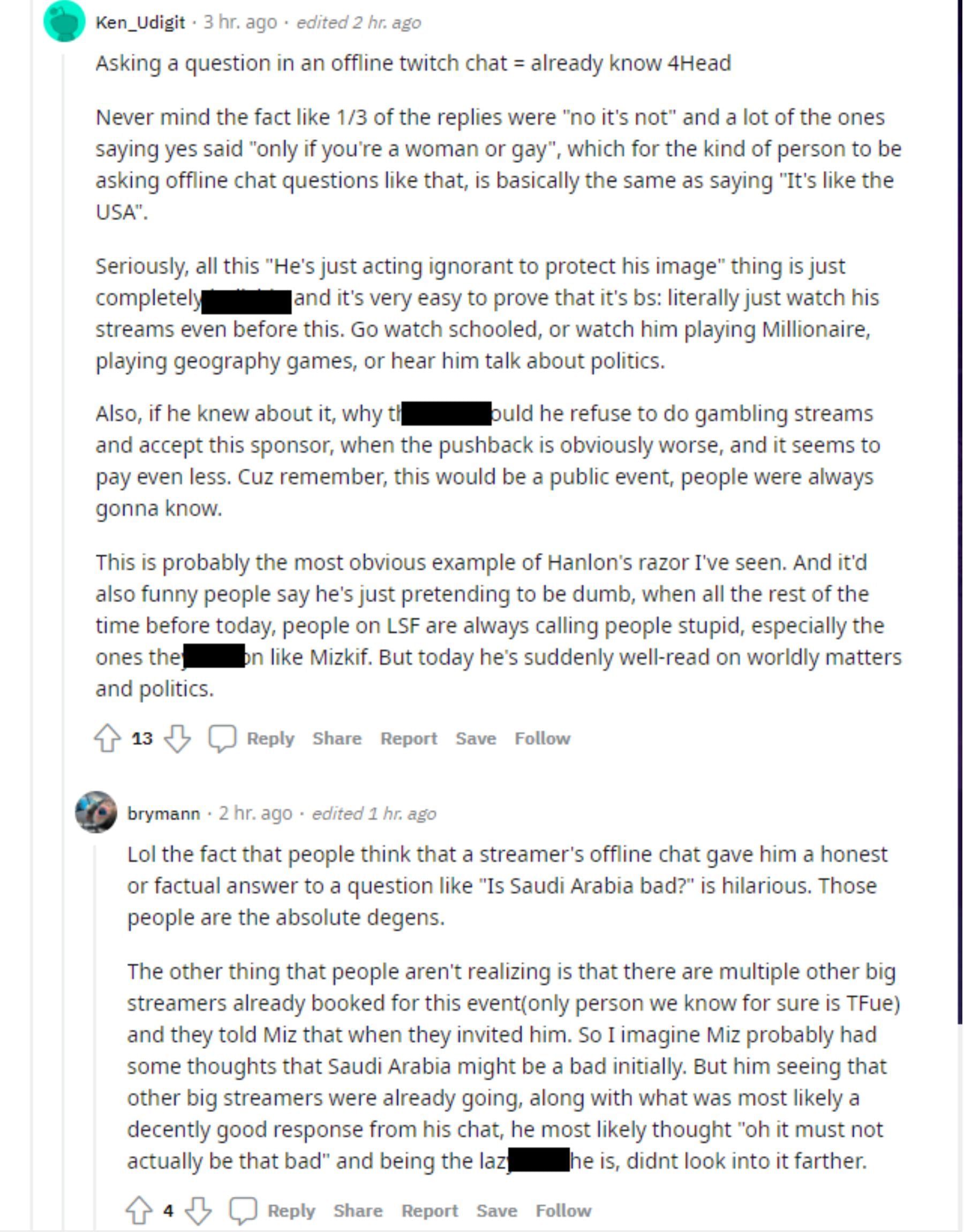 While some felt it was an act, others pointed to the various streams where trivia or world knowledge were on display. Redditors who highlighted this also pointed out that if he were forgoes gambling sponsors, why would he pick Saudi Arabia as one, when the public backlash would be significantly greater? They didn't think it was an act at all.