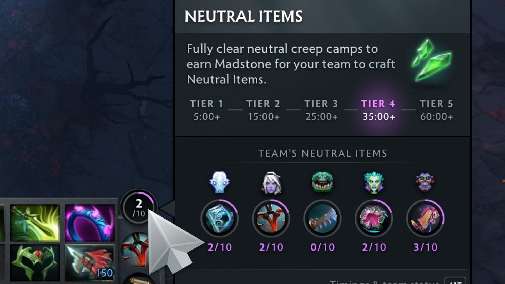 Madstone is earned by fully clearing a Neutral Creep camp. The player who delivers the final hit to the last creep in a camp will receive two Madstone, while a random teammate will get one Madstone. These resources are crucial for crafting custom Neutral Items that enhance a hero’s capabilities.