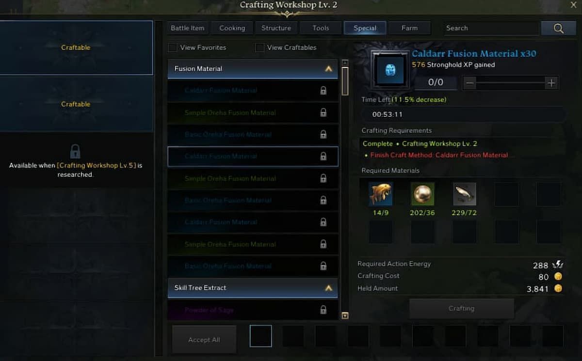 Crafting Caldarr Fusion Material is a bit time-consuming, but it is definitely the most cost-effective way to obtain it. Players can gather the required ingredients and craft the item in their Stronghold.