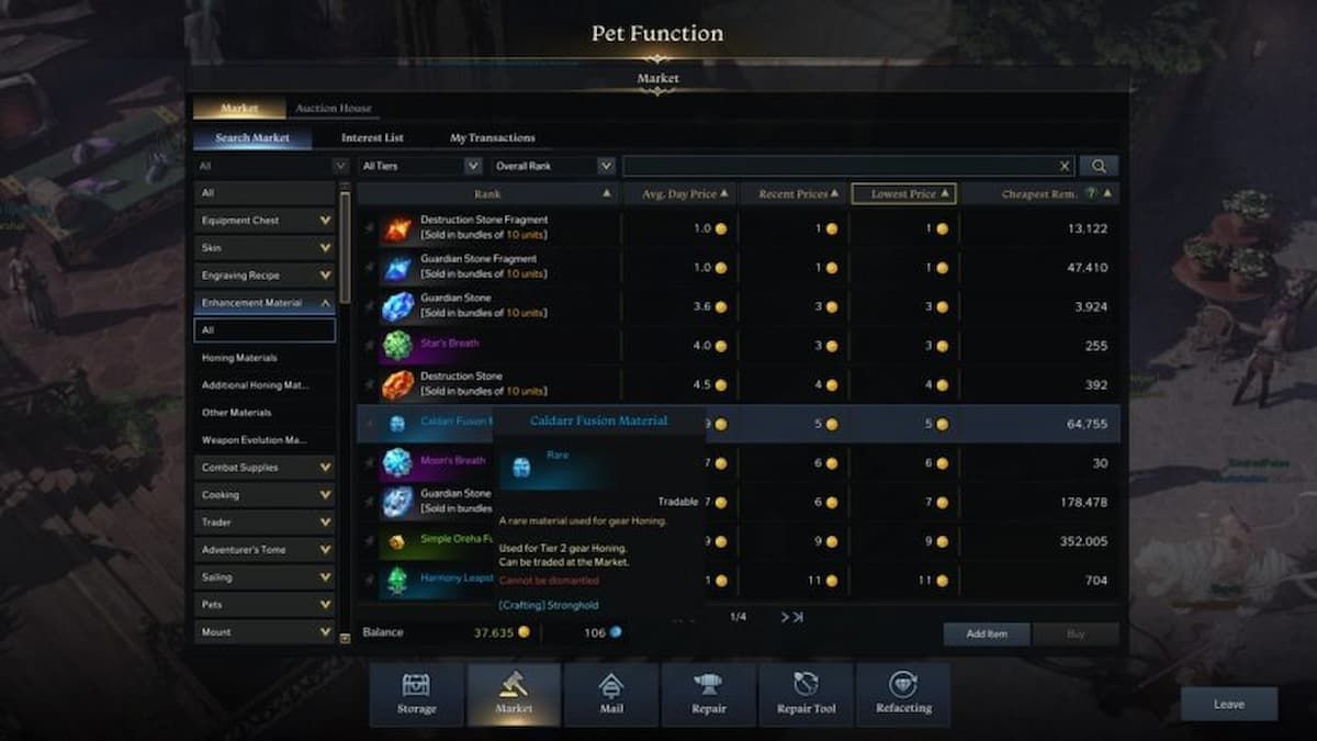 Players can simply head to the Market on any continent and navigate to the Enhancement Material tab. They can then look into the listings for Caldarr Fusion Material and select to purchase a bulk amount.