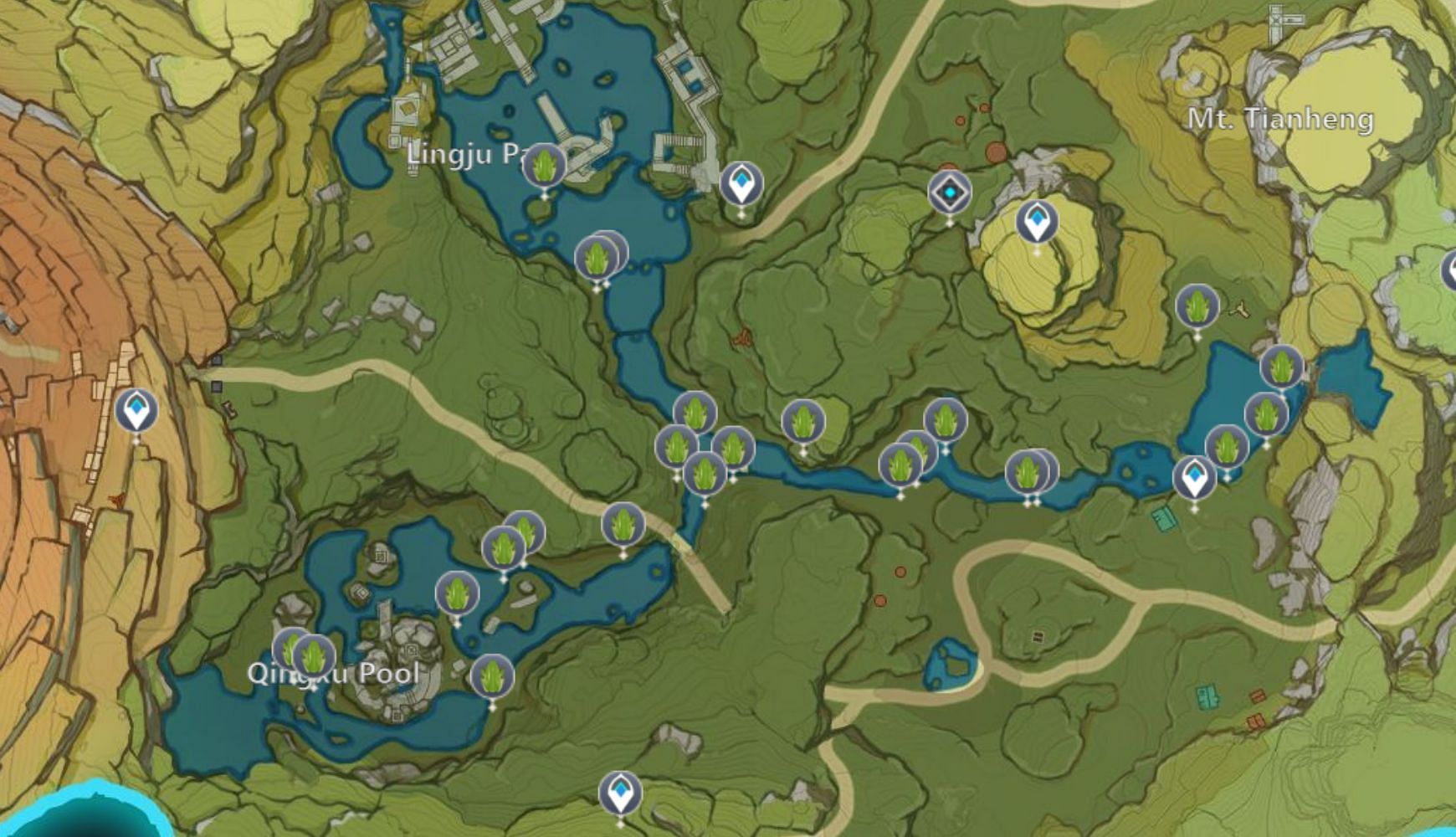 Alternatively, the long stretch of water connecting Lingju Pass and Qingxu Pool is another great location to farm them. There are 24 Frogs along this riverbank. Travelers can use any of the nearby Teleport Waypoints to start with, as they'll eventually teleport around after collecting all of these creatures from one area.