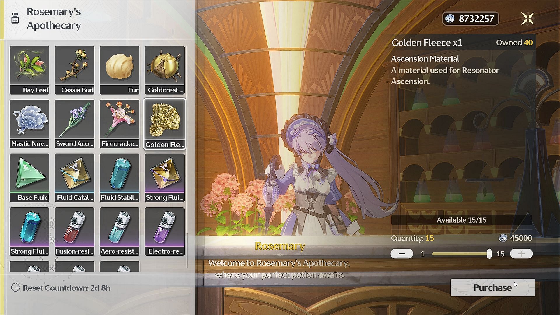 The best and easiest way to get Golden Fleece in Wuthering Waves is to buy them from Rosemary's Apothecary in Ragunna City. Use the southern Resonance Beacon in the City Square and turn around to find the NPC shop. You can buy up to 15 Golden Fleece at a time, for 3000 Shell Credits each. Fortunately, the stock of items in the shop refreshes, so you can come back later for more.