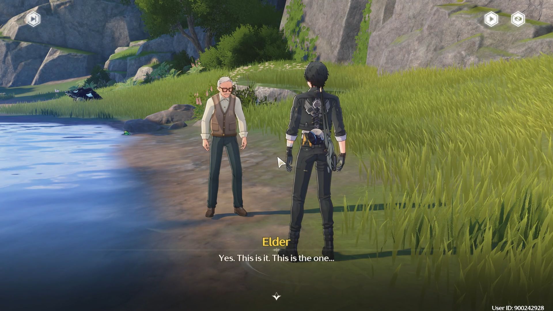 You will hear a strange sound mid-conversation. Upon inspection, it is revealed to be the old man that you were tasked to find at the start of the quest, by his nephew, standing next to a lake.