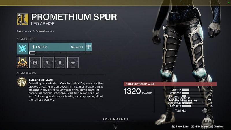 In Destiny 2, Prometheus Spur is an exotic leg armor that arrives with a total of 63 base stats. Part of Xur's collection, it also boasts 17 intellect.