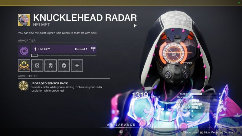 Knucklehead Radar is the exotic headgear for the Hunter class in Destiny 2. Xur has brought it in with a total of 61 base stats, with 17 Mobility and 17 Discipline.
